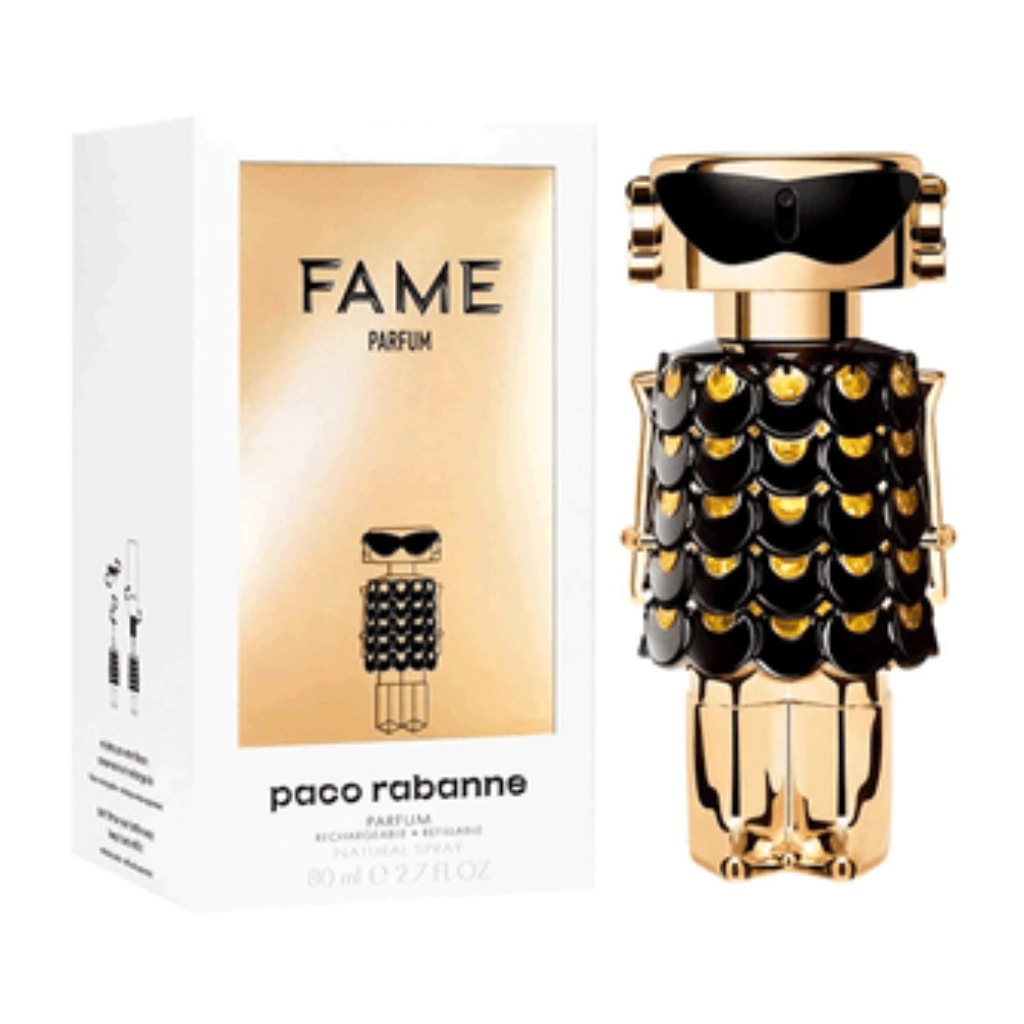 Fame Parfum de Rabanne es una fragancia de la familia olfativa Floral Frutal Gourmand para Mujeres. Las Notas de Salida son mango, bergamota y pimienta rosa; las Notas de Corazón son jazmín, pachulí y Incienso; las Notas de Fondo son sándalo, benjuí y almizcle.